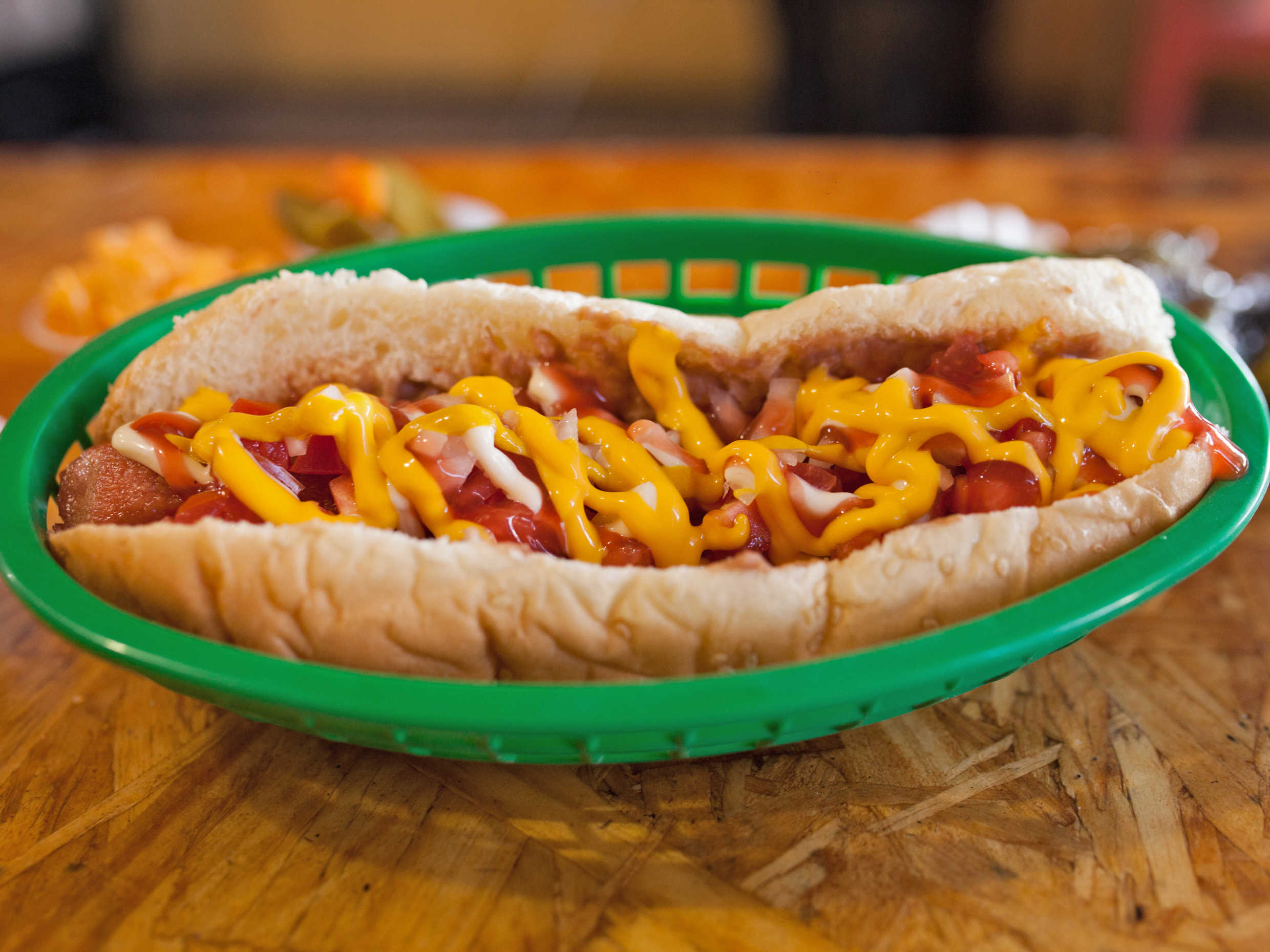 Frijoles, tomate, cebolla, tocino, cátsup, mayonesa, mostaza y queso amarillo.