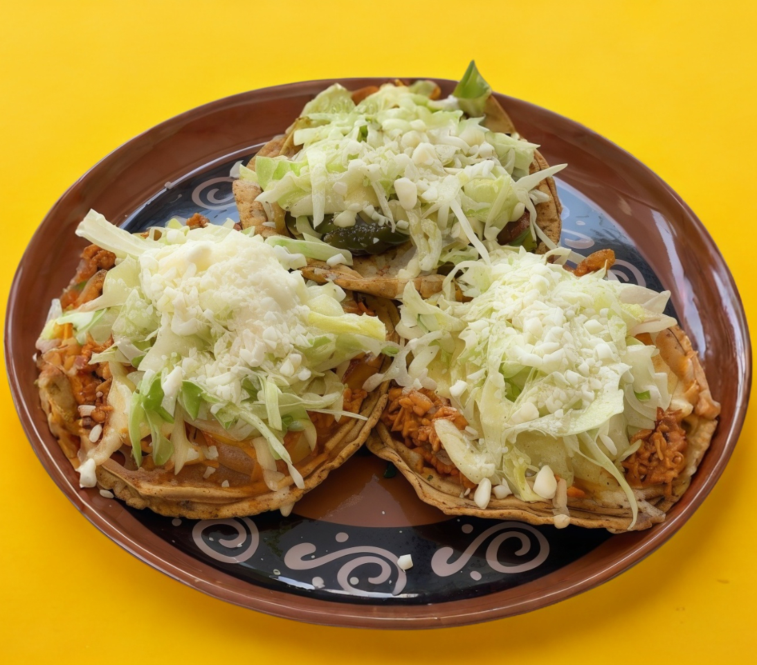 Guisado a elegir con frijol, lechuga, crema y queso (deshebrada, chicharrón, picadillo, papas, rajas, champiñones, cuitlacoche, flor de calabaza, tinga, sesos, queso o bistec).