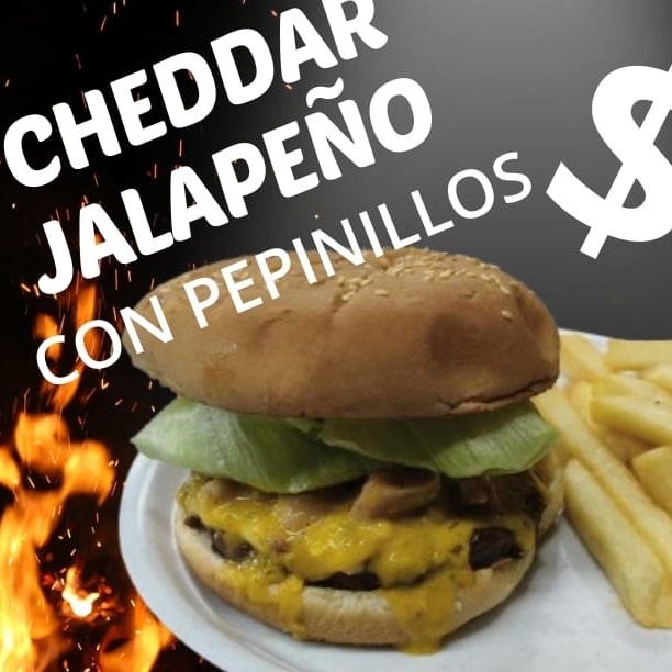 Carne, queso, tocino, cheddar jalapeño, pepinillos, lechuga, mayonesa