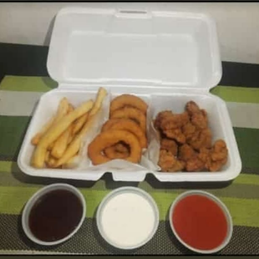 Boneless, aros, papas, incluye 2 aderezos pequeños, 1 agua sabor o soda 400 ml.