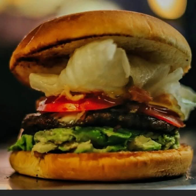 Carne, queso, tocino, aguacate, lechuga, aderezos.