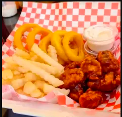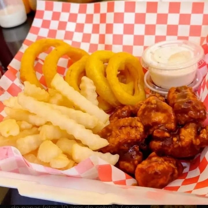 1 kg de boneless (peso en crudo) en 4 de tus salsas favoritas, aros de cebolla o Ensalada (lechuga y tomate), ranch y catsup