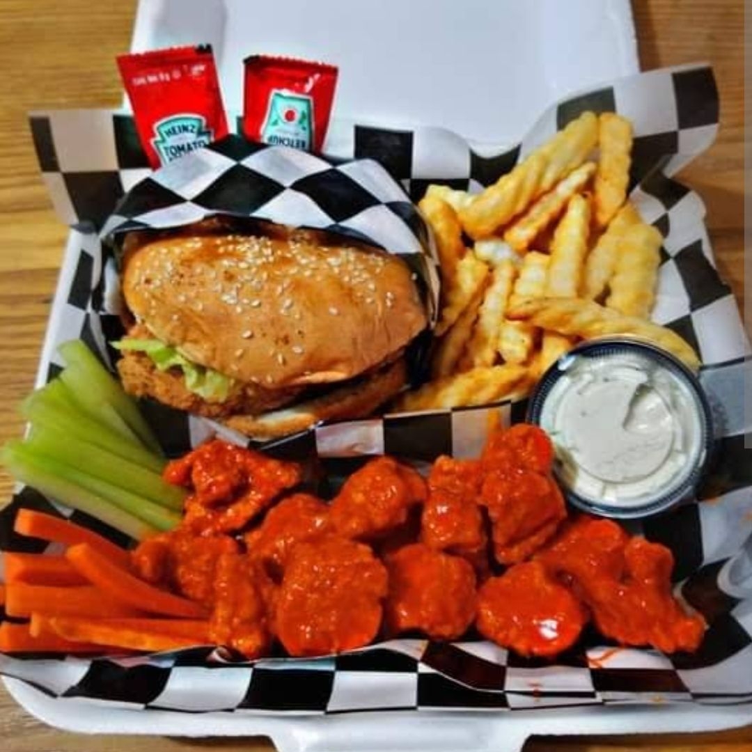 500gr en su salsa favorita (peso en crudo‼️), papas fritas, 6 Aros de cebolla o ensalada, catsup y ranch