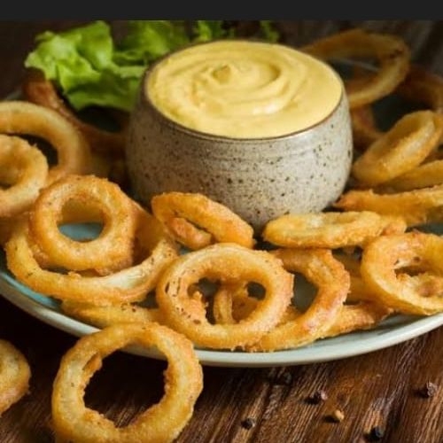 Aros de cebolla bañados en queso amarillo