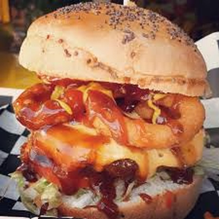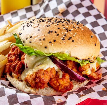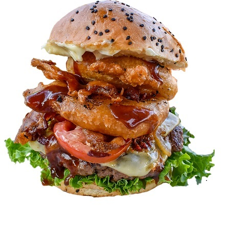 Carne de hamburguesa, boneless bañados en tu salsa preferida, aros de cebolla,queso amarillo, lechuga y tomate.