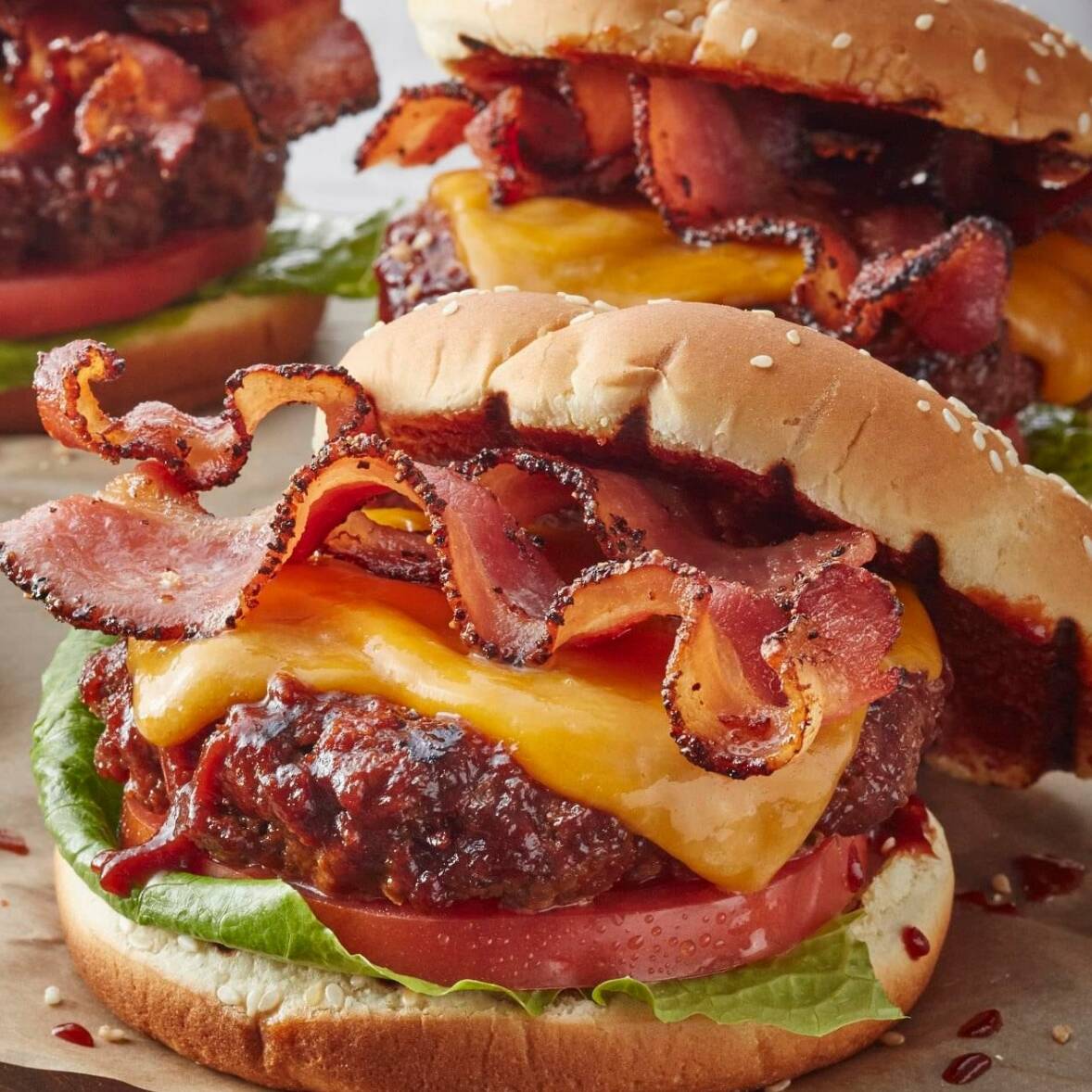 Dos carnes de hamburguesa, tocino, aros de cebollas, lechuga, queso amarillo