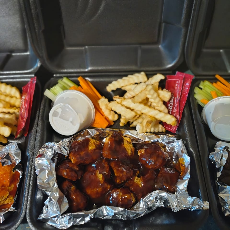 250 gr de boneless ( peso crudo ) , bañados en tu salsa favorita, acompañados de una porcion de papas ala francesas, aderezo ranch, zanahoria y apio.
