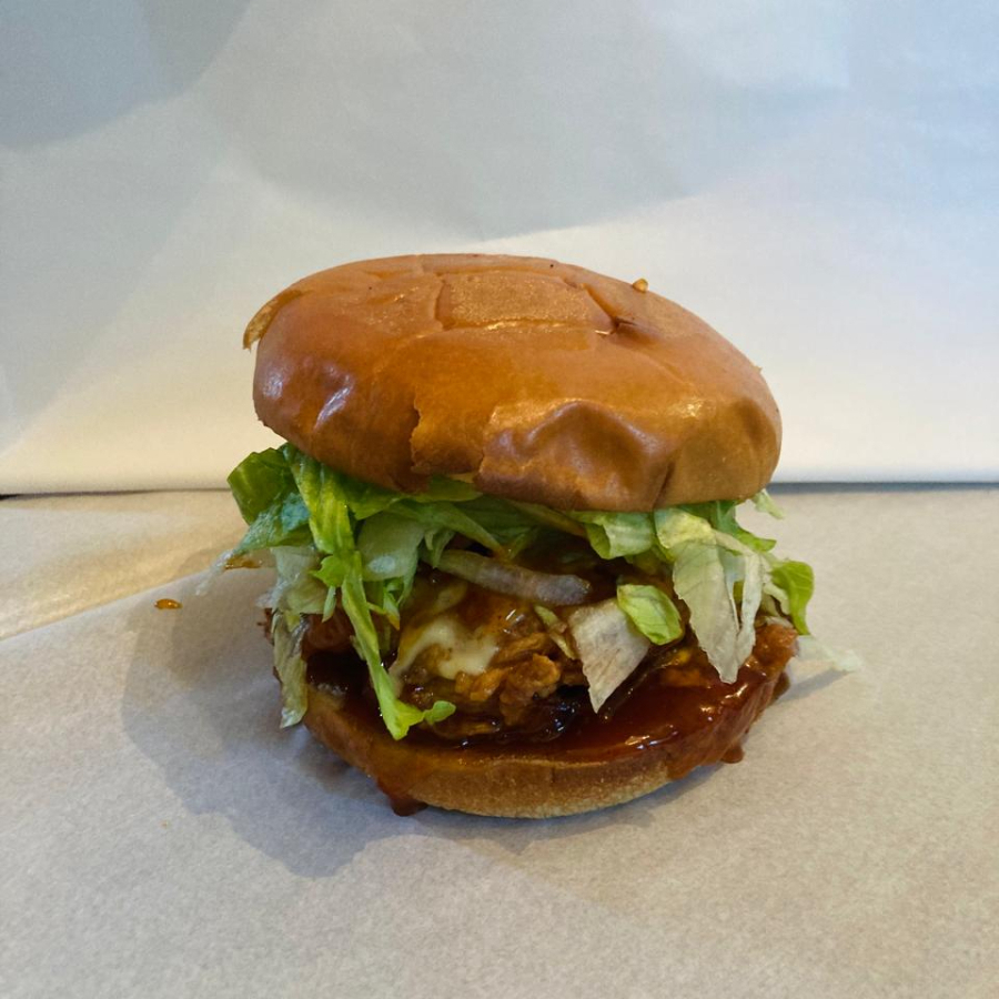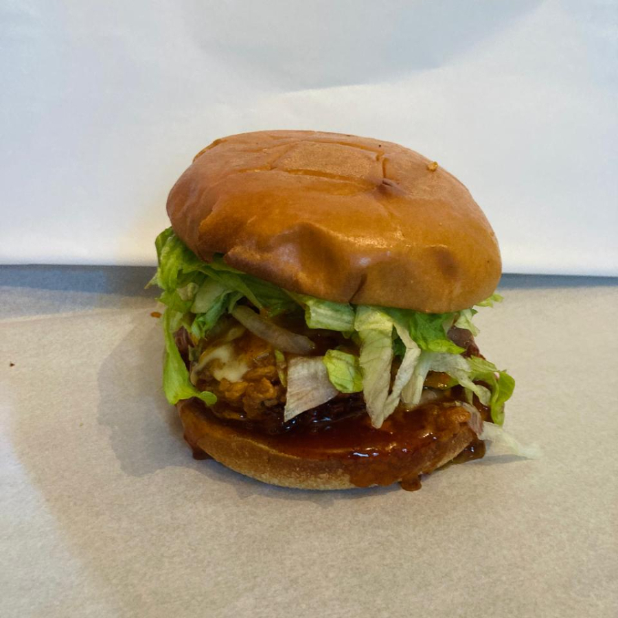 Pollo empanizado, tocino, lechuga, tomate, mayonesa, catsup, mostaza. El pollo puede ser bañado en alguna de las siguientes salsas a elejir (favor de especificar): BBQ,Buffalo,Teriyaqui, Mango habanero,chipotle)