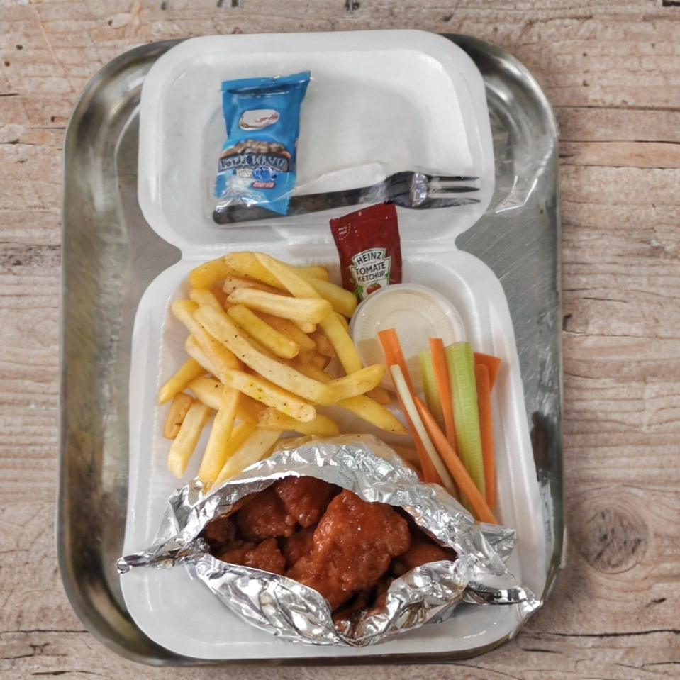 500gr de boneless en 2 salsas, incluye bastones de verdura, ranch, catsup y 1 complemento a elegir.