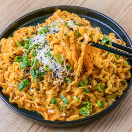 Delicioso ramen coreano, sabor a pollo picante con la cremosidad de la salsa carbonara, como topping ajonjoli, cebollin y queso rallado.