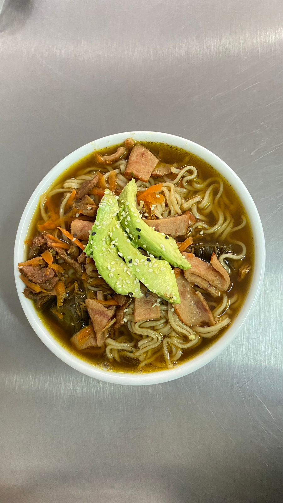 Res, tocino, toreado. Fideos japoneses con cebollín y zanahoria.