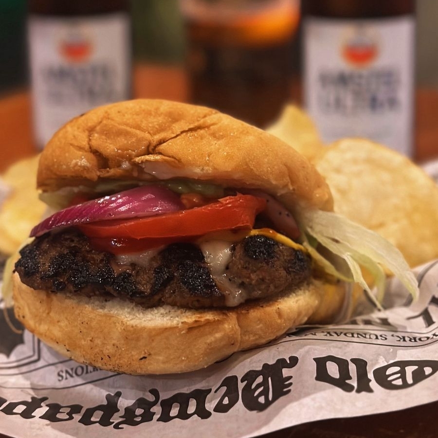 Hamburguesa de res, queso mozarela cebolla morada, tomate, mayonesa, mostaza, catsup y salsa de aguacate habanero