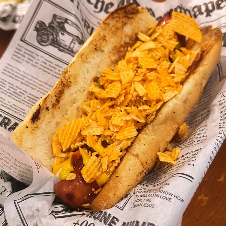 Hot dog de res con catsup, mayonesa, queso mostaza y ruffles