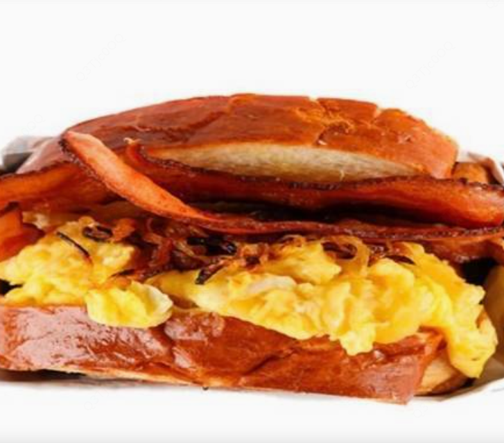 Pan brioche, huevo revuelto, mezcla de quesos, tocino ahumado, cebolla caramelizada, acompañado de chips.