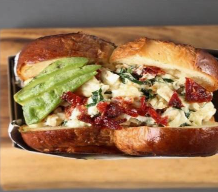 Pan brioche, claras revueltas, espinaca, aguacate, tomate deshidratado, queso de cabra, acompañado de chips.