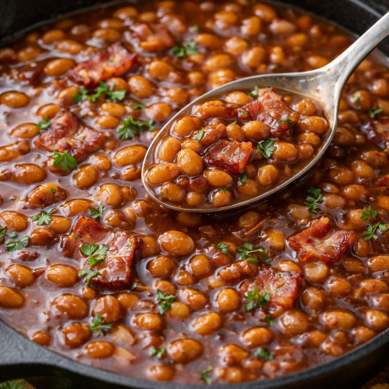 Famosos frijoles BBQ de la casa con trozos de tocino y cebolla, el complemento perfecto. Porción individual.