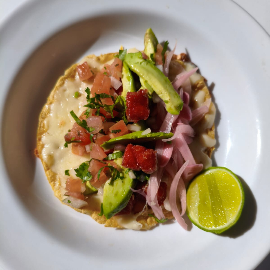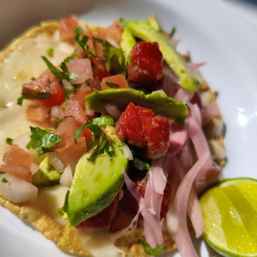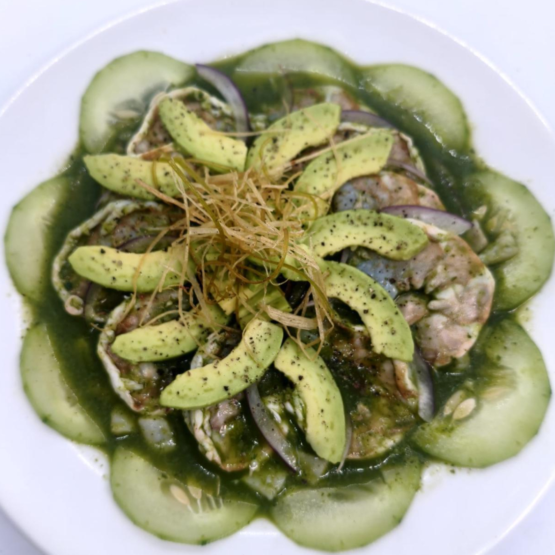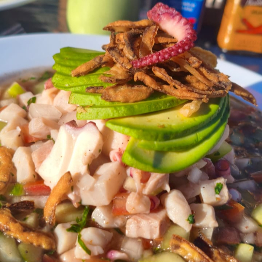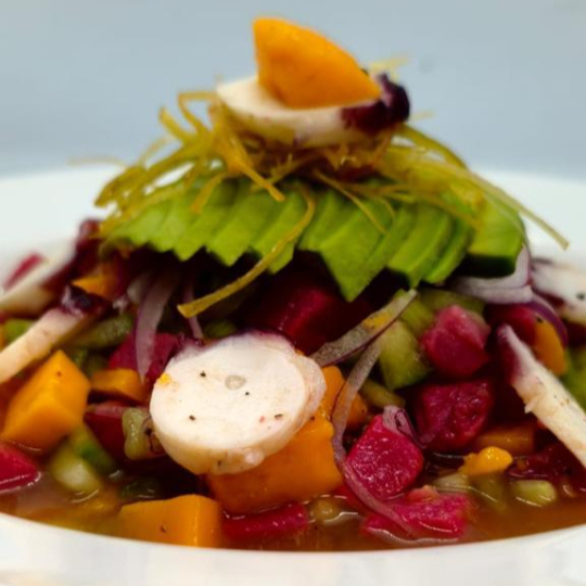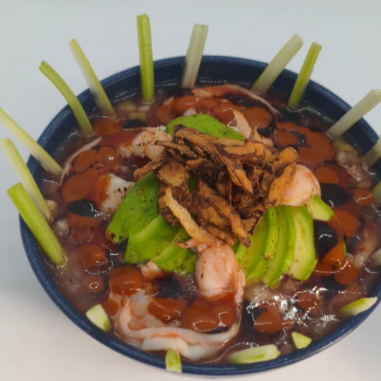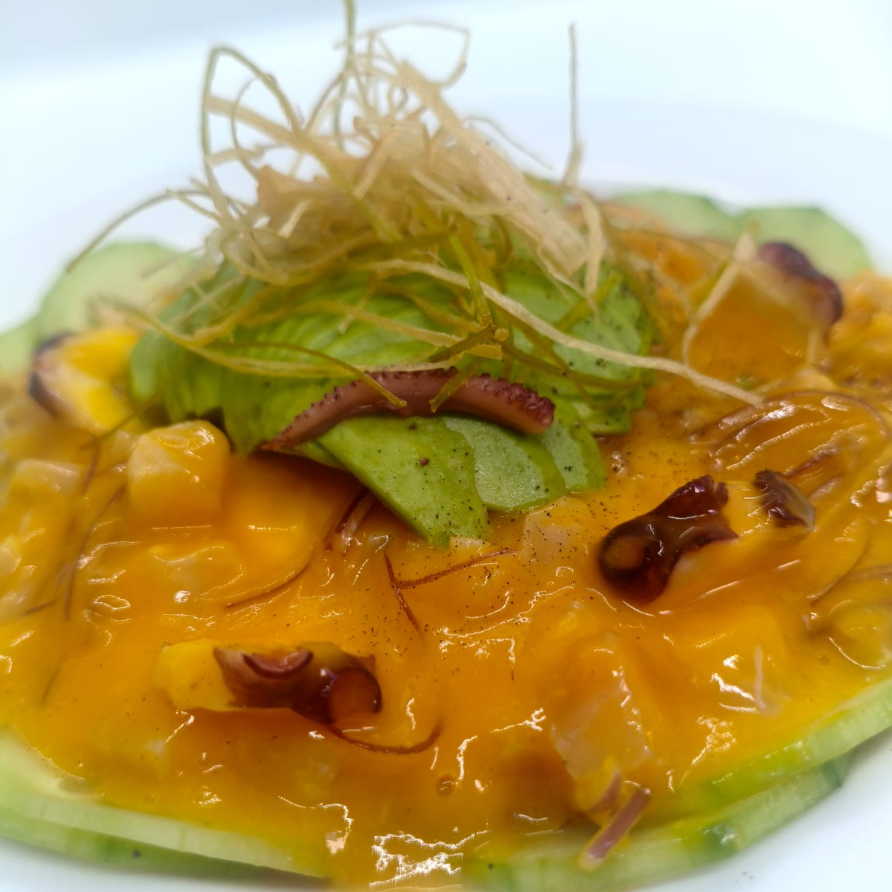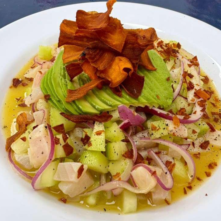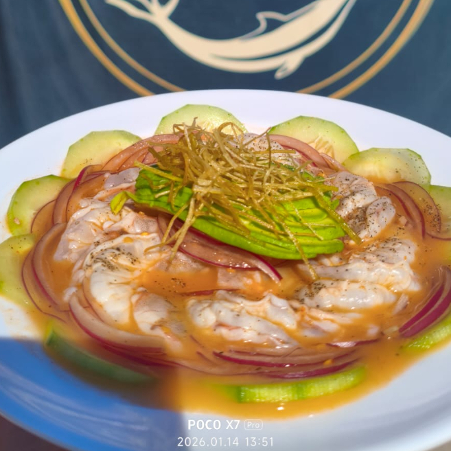 Base de limon y naranja, con salsa de soya. Acompañado de mango, cebolla morada y pepino