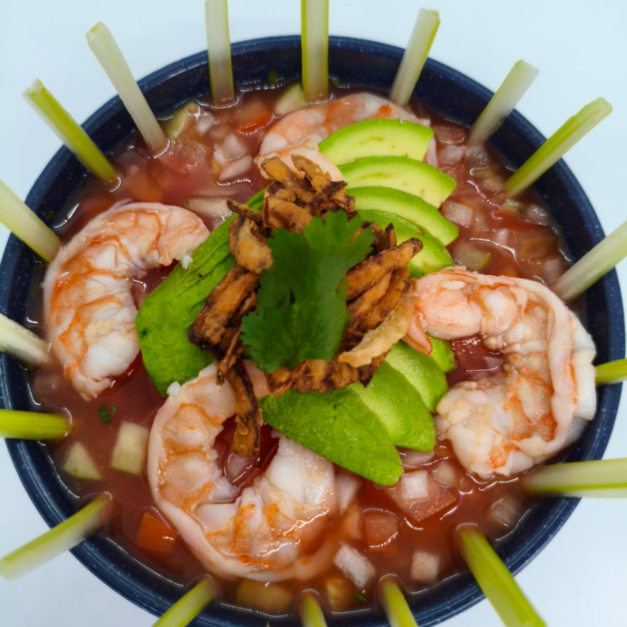 Jugo de clamato, limon y pimienta. Acompañado de cebolla blanca, apio, tomate, cilantro y pepino