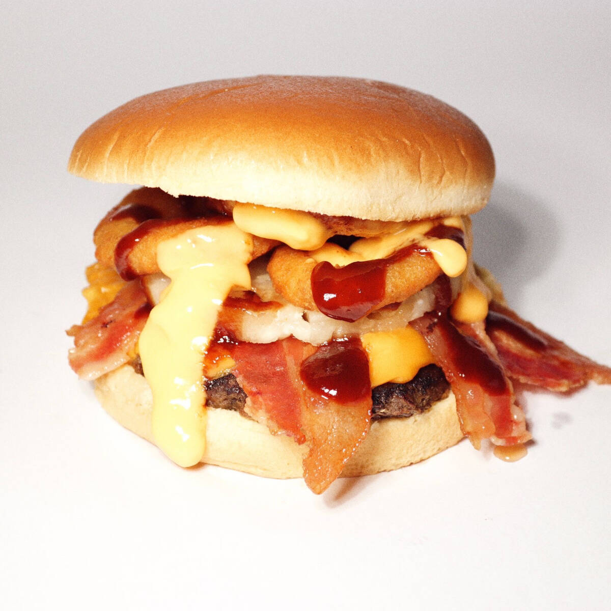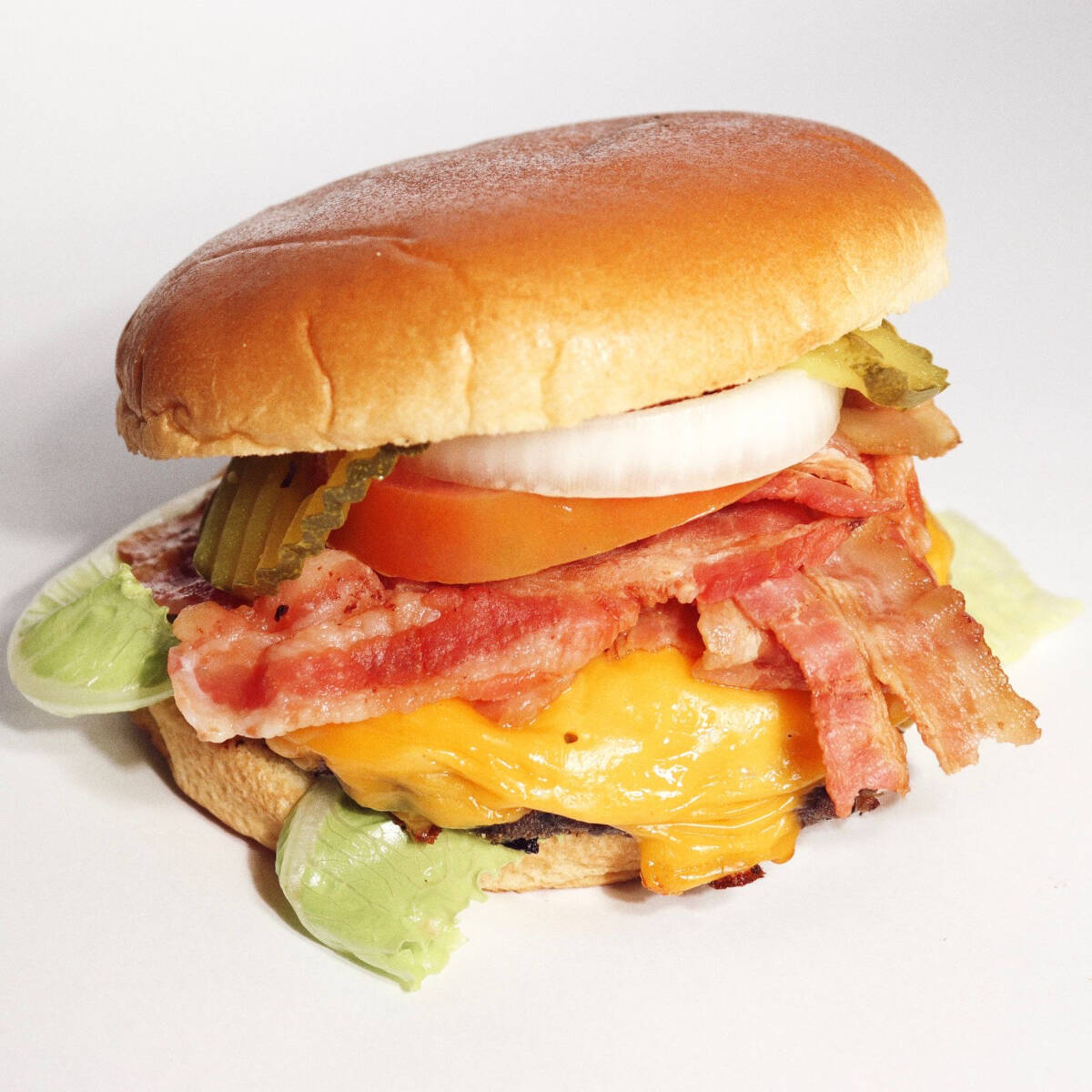 Carne de res, tocino, queso americano, lechuga, tomate, cebolla, pepinillos y aderezos.