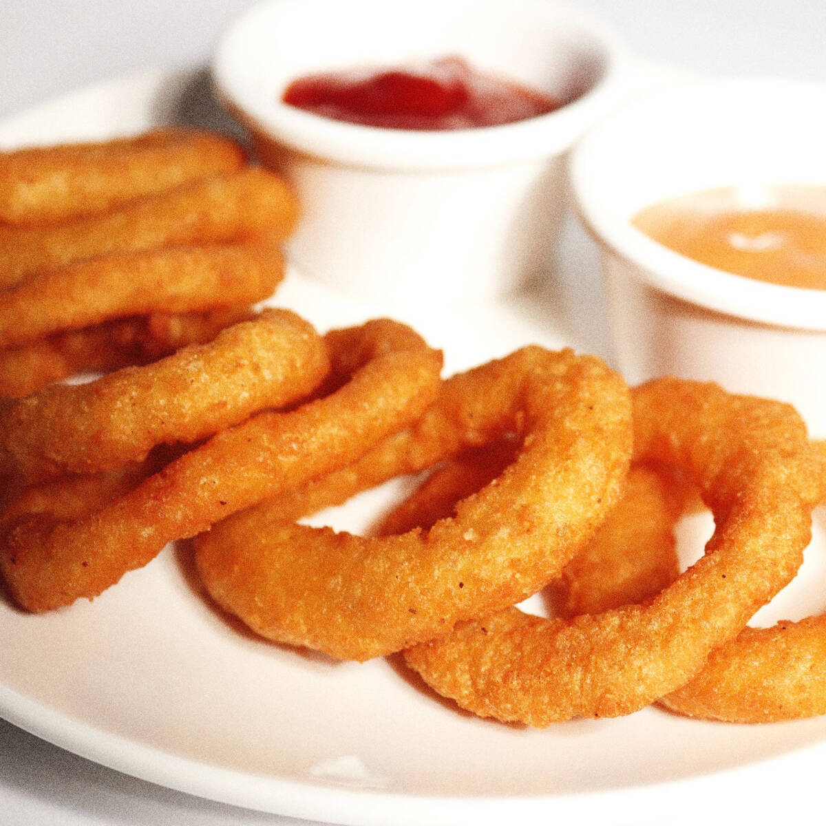 Medallón de pollo tempura, lechuga, tomate, cebolla y aderezos