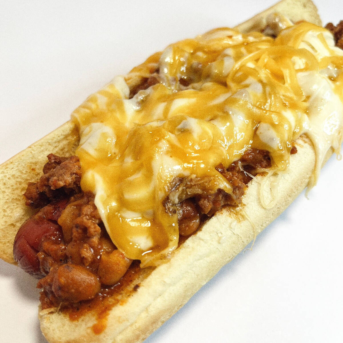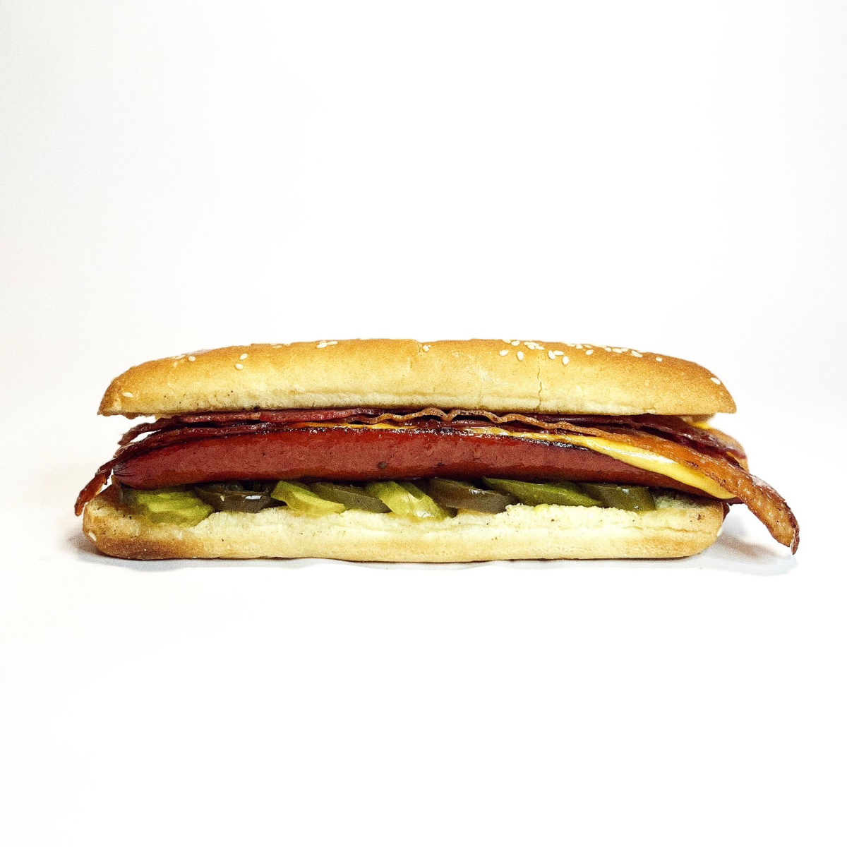 Salchicha de res, tocino, queso americano, jalapeño, pepinillos y aderezos