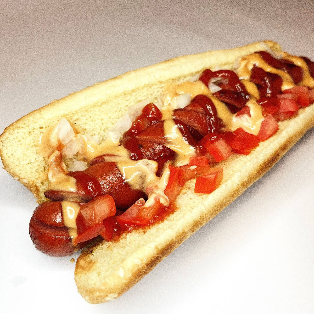 Salchicha de res, jalapeño, tomate, cebolla, pepinillos y aderezos