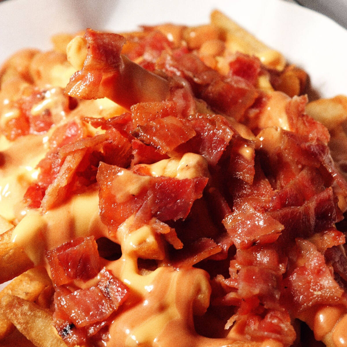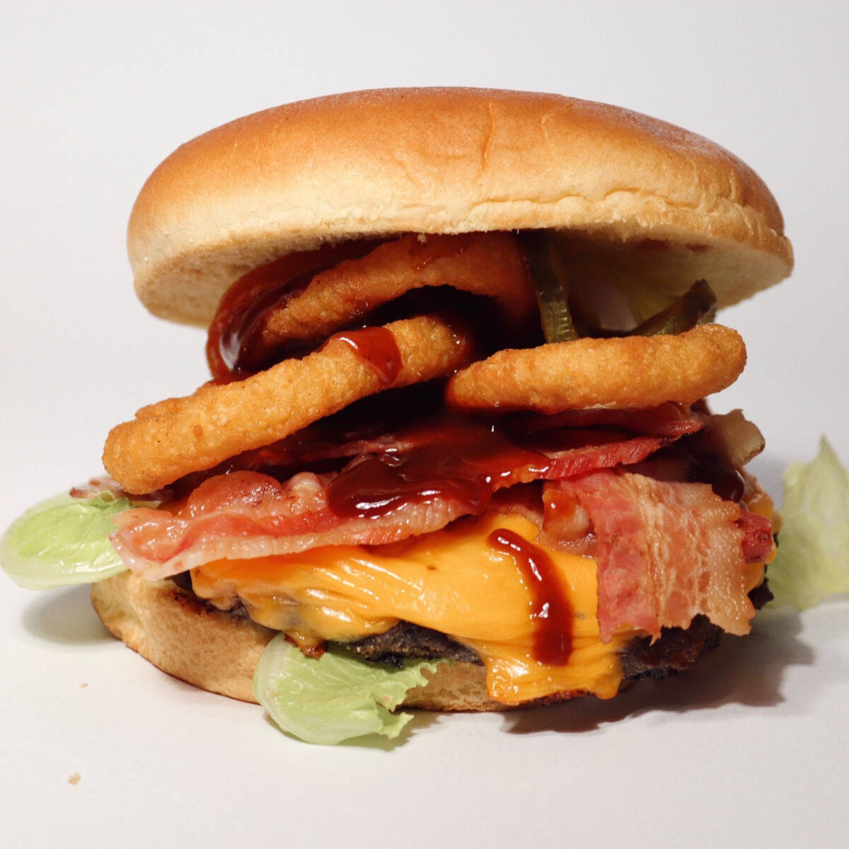 Carne de res, aros de cebolla, tocino, queso americano y bbq