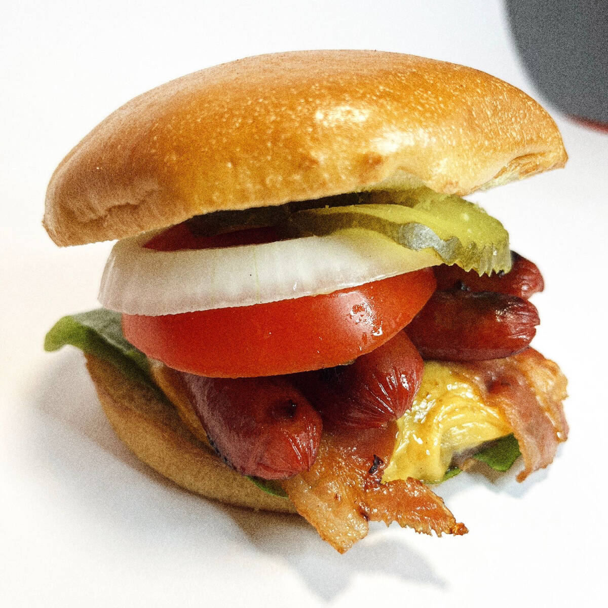 Carne de res, tocino, salchicha de res, queso americano, lechuga, tomate, cebolla, pepinillos y aderezos.
