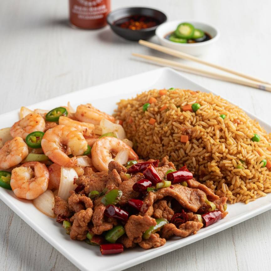 La combinación de mar y tierra que estabas esperando. Jugosos camarones salteados a la perfección, acompañados de tu guisado preferido. Un toque de lujo y sabor que eleva tu comida a otro nivel.