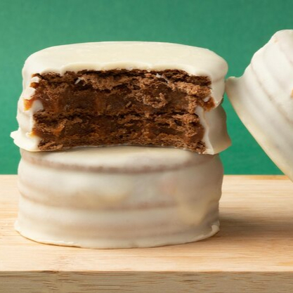 doble galleta , rellena de dulce de leche bañada en chocolate negro o blanco