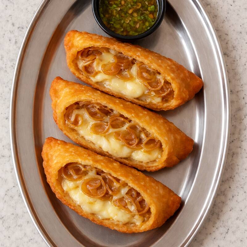 Bistec cortado a cuchillo, cebolla blanca, mix de pimientos y queso muzzarella