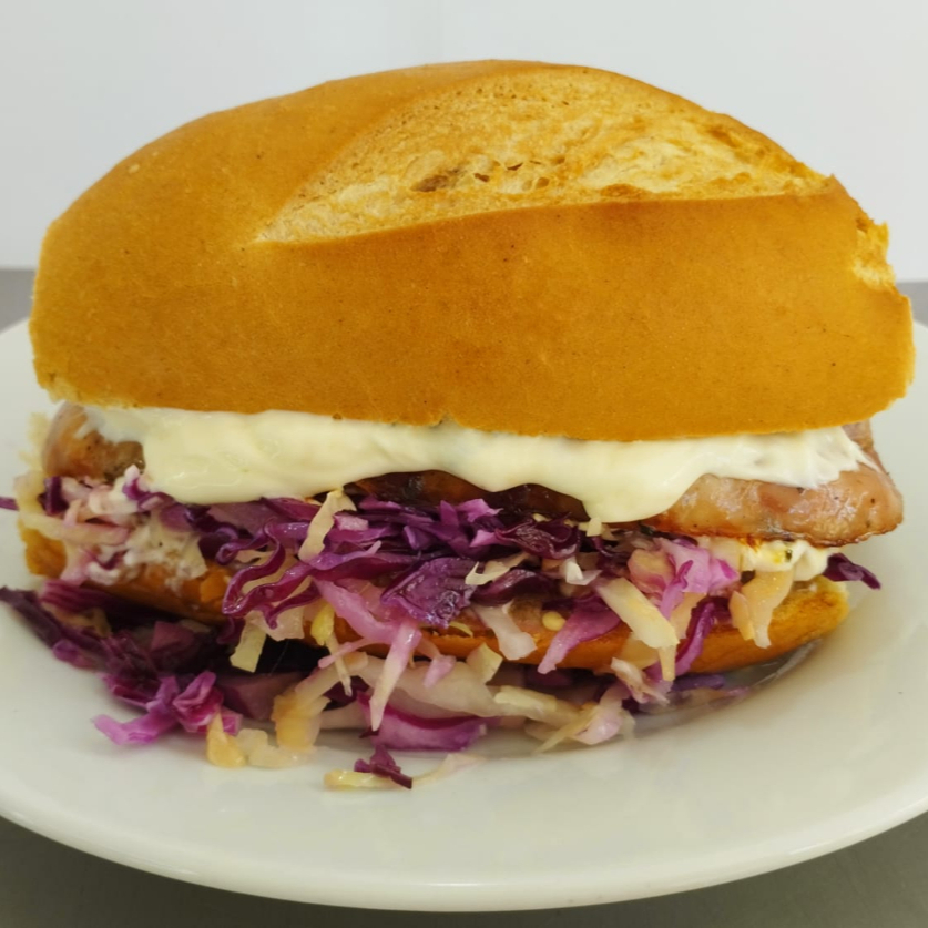 Chorizo argentino en pan saborizado, con lechuga, cebolla, tomate, mayonesa, chimichurri y tocino, acompañado de media orden de papas fritas