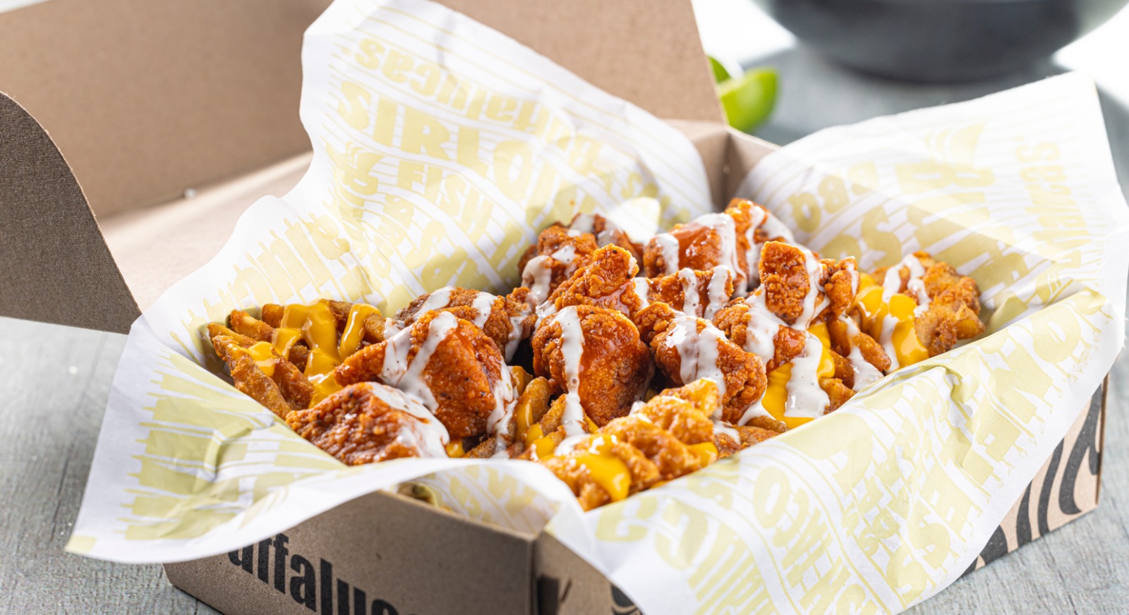 Deliciosos boneless bañados en buffalo, acompañados de papas criss cut bañadas en queso cheddar y ranch