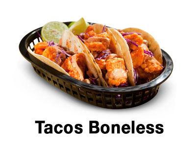 4 piezas, tortilla de maíz, boneless bañados en salsa buffalo, col morada, frijol ranch y aderezo chipotle