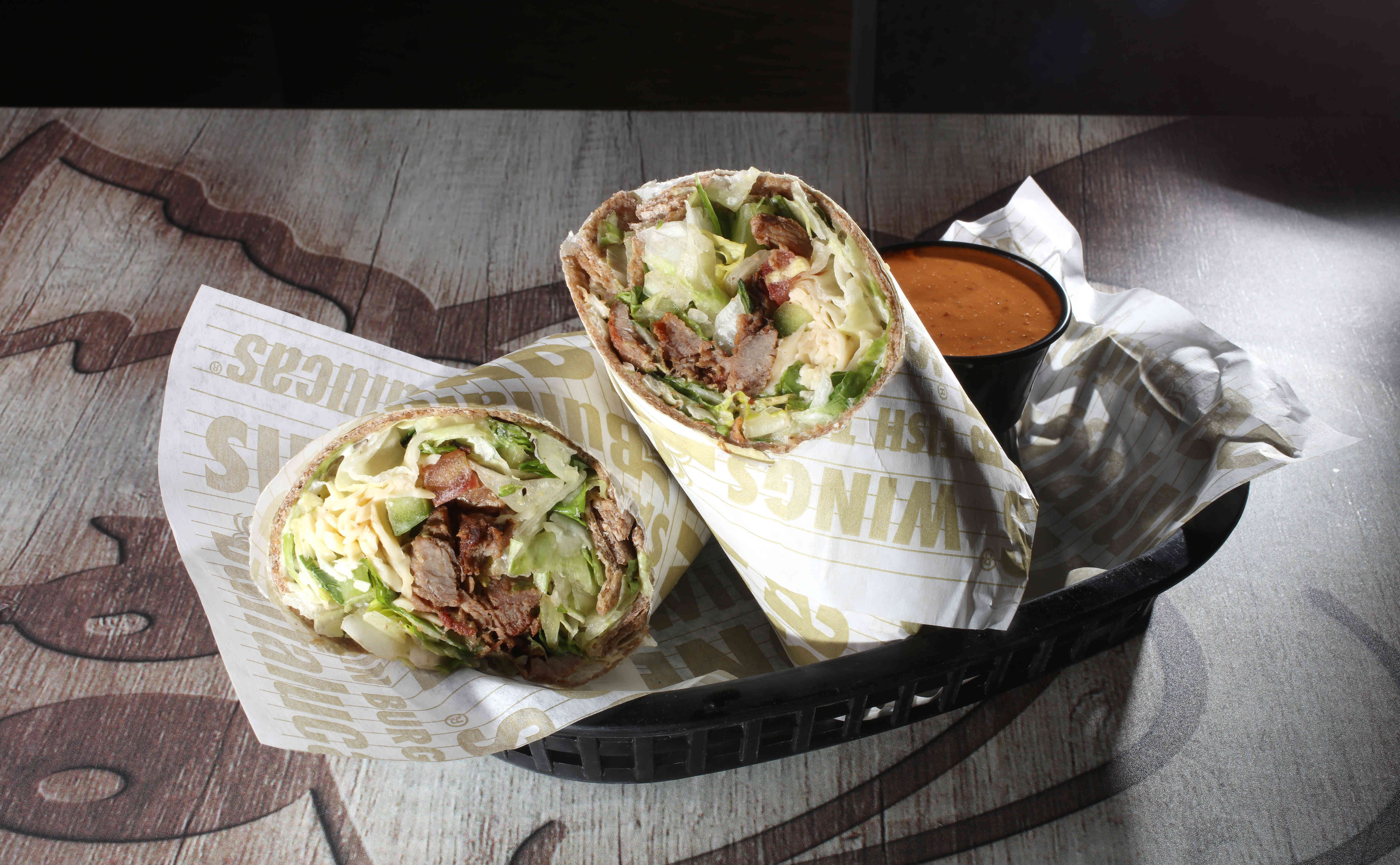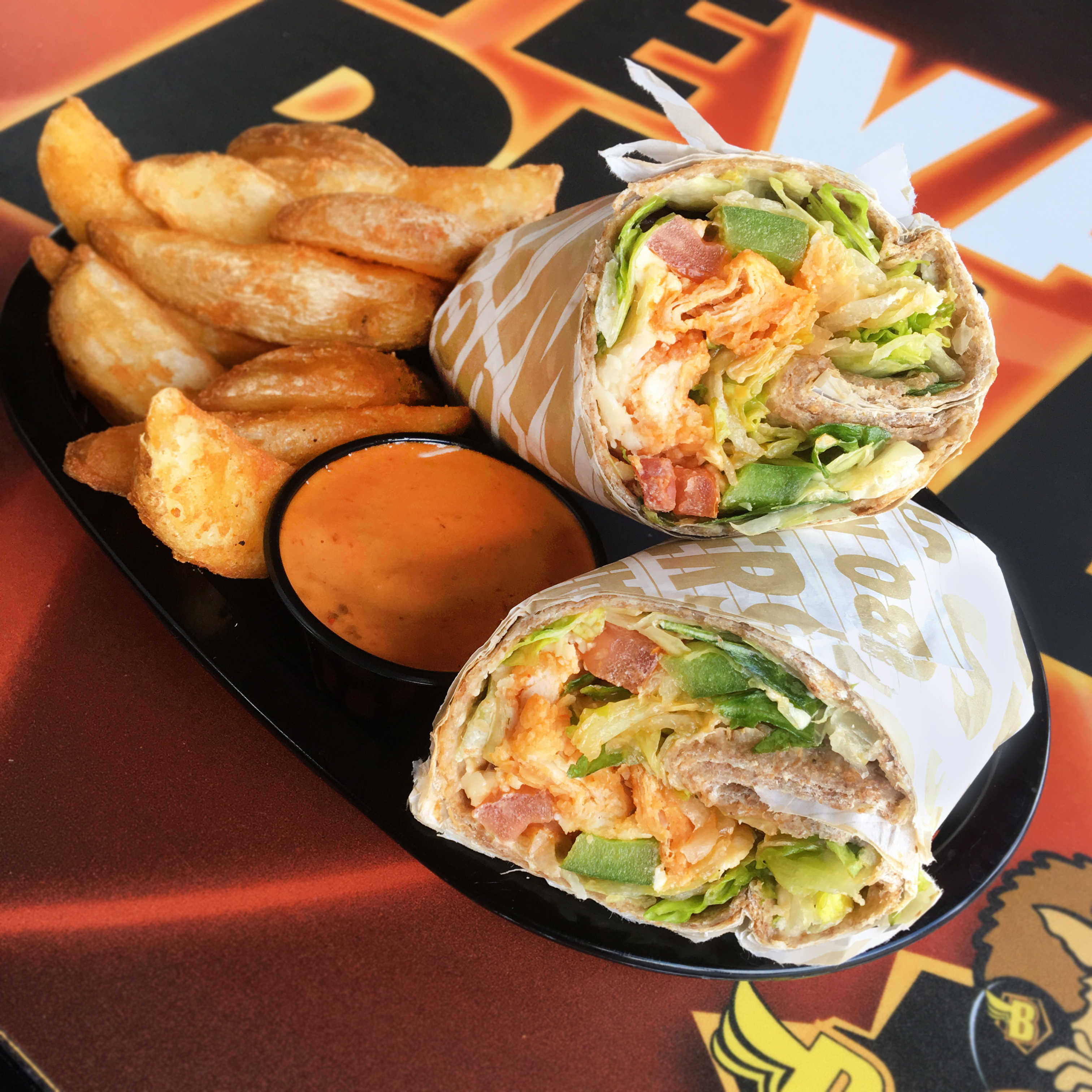 Tortilla delgadita de harina integral, pechuga empanizada bañada en salsa buffalo, tira de ranch, lechuga, queso, tocino, tomate y chile morrón. Acompañada de aderezo chipotle.