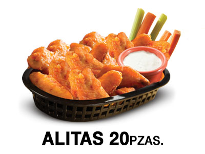 20 Alitas en dos sabores a elegir, 2 boneless grandes en dos sabores a elegir, 1 papas grandes, 1 aros de cebolla grandes y 1 refresco de 2 litros.