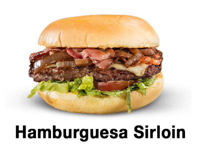 Carne 100% sirloin, queso, tocino, cebolla acitronada con champiñones, tomate, lechuga, cátsup, mostaza y mayonesa