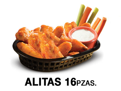 Alitas, papas o aros de cebolla o ensaladita y refresco.