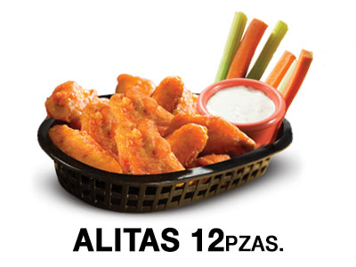 12 Alitas, 1 papas grandes, 1 aros de cebolla grandes y 2 boneless grandes.