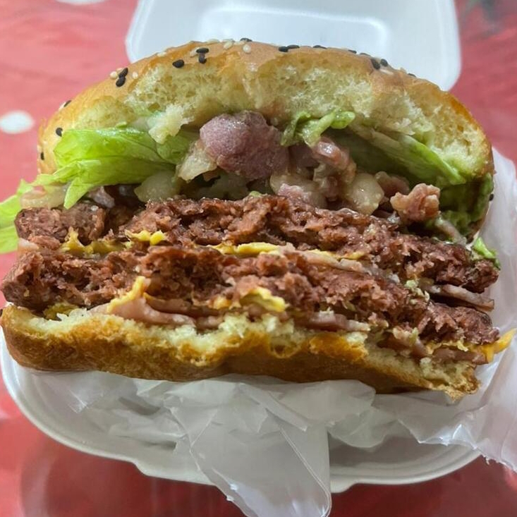 Doble carne sabor arrachera, doble queso, doble jamón, tocino, lechuga, tomate, aguacate y aderezos