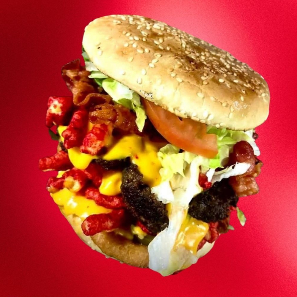Carne, Tocino, Cheetos Flaming bañados en Queso Amarillo, Verdura (Lechuga, Tomate, Cebolla y Pepinillos).