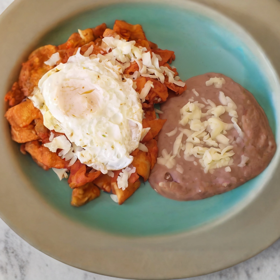 Chilaquiles rojos montados con 1 huevo estrellado acompañados de frijoles (NO incluye crema).