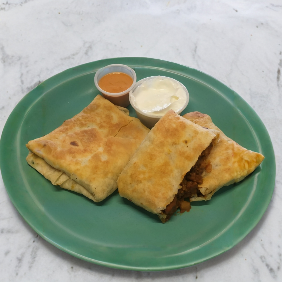 Orden con 2. Burrito cuadrado freído con el guiso de tu preferencia, acompañados de crema y salsa.