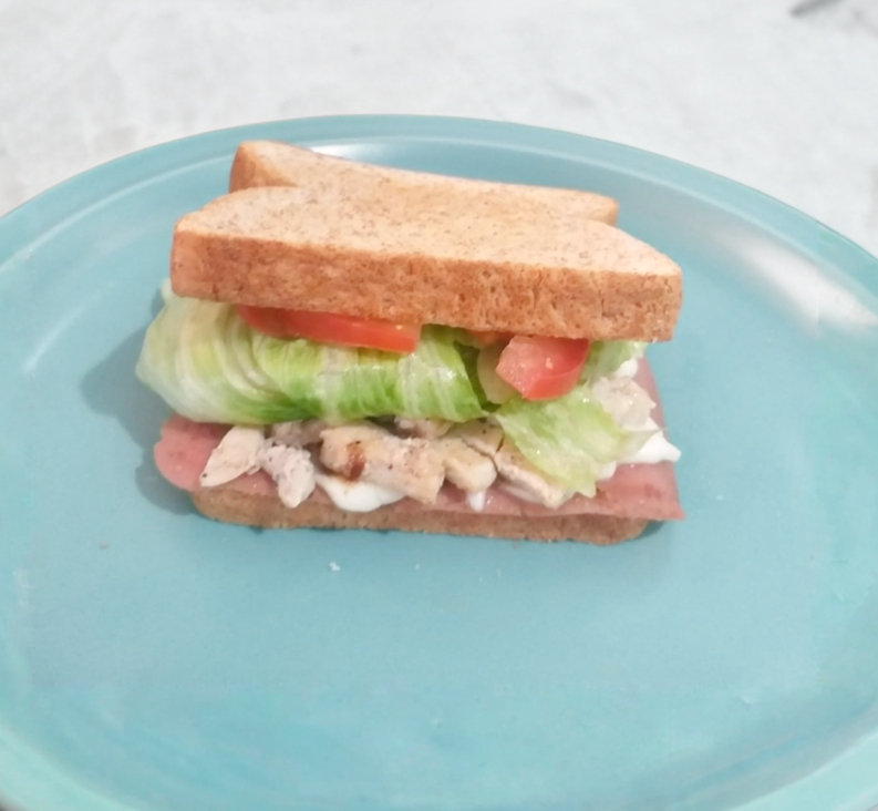 Pan integral, jamón, queso, pollo a la plancha (50 gr), lechuga y tomate.
