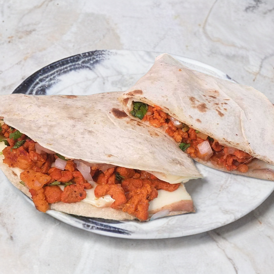 Tortilla de harina con un toque de frijoles, asadero y el guiso de tu preferencia.