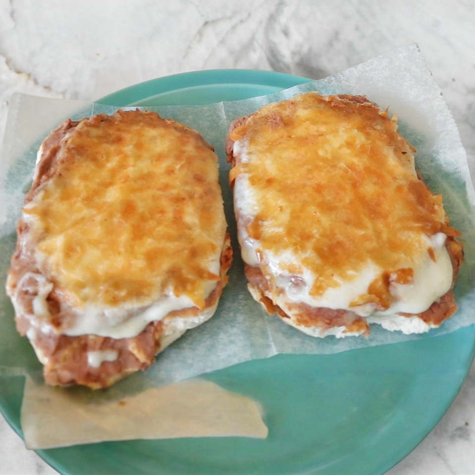 Dos mitades de pan con frijoles y queso gratinado, puedes agregar el guiso de tu preferencia