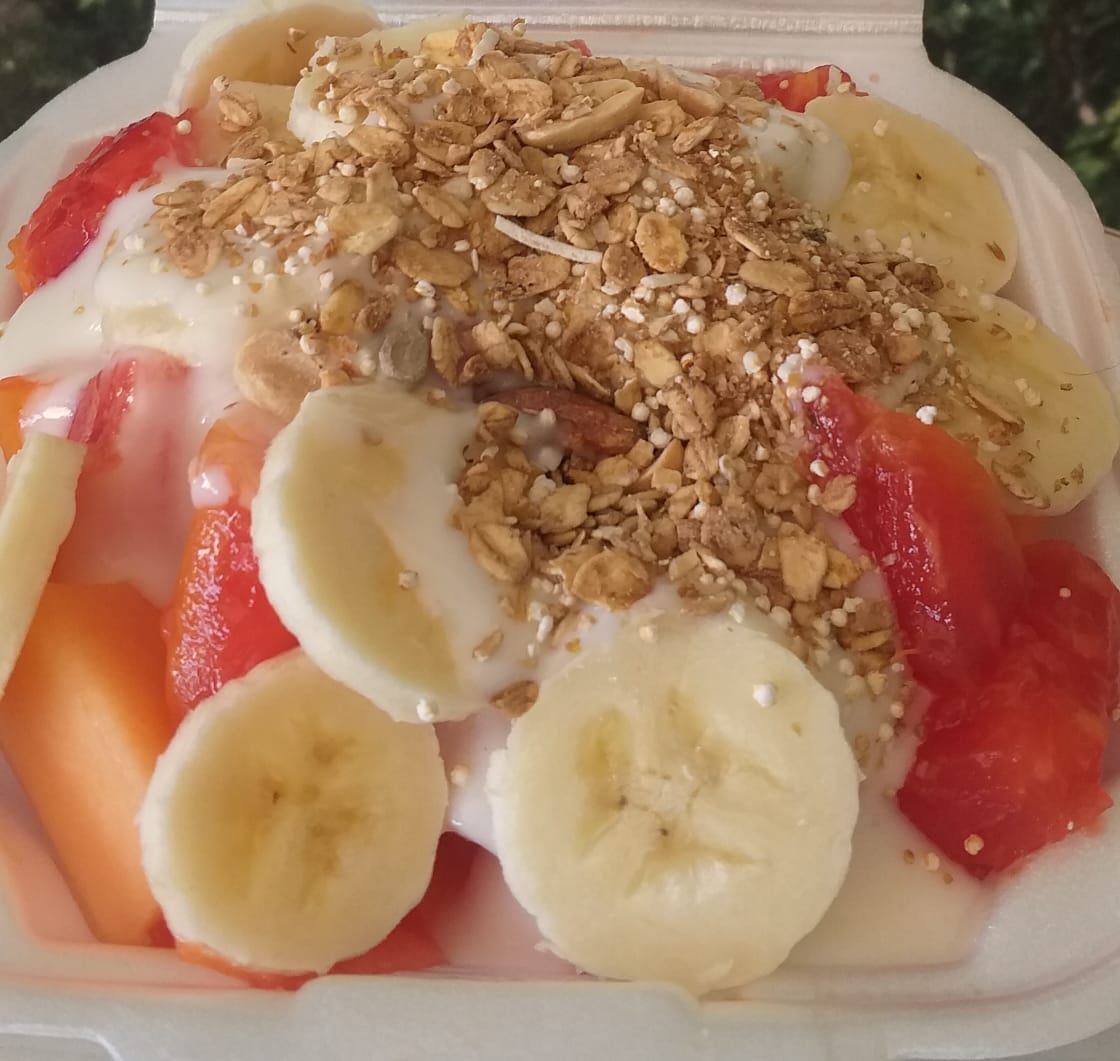 Papaya, melón y plátano, acompañados de yogurt natural y granola.