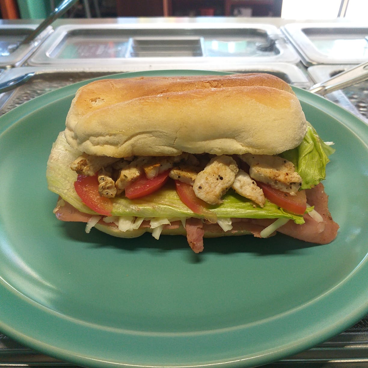 Pollo a la plancha (100 gr), jamón, queso, lechuga y tomate.