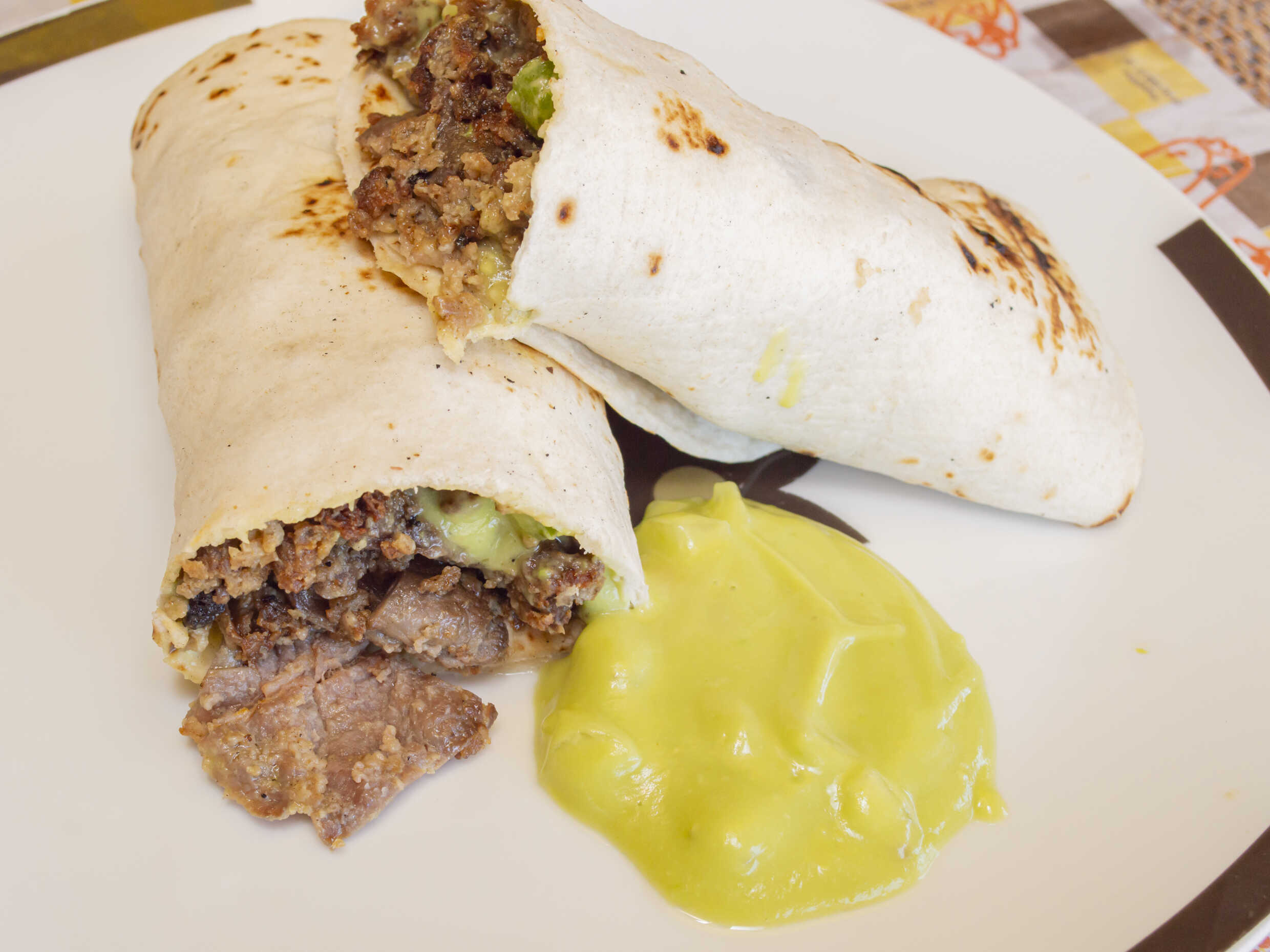 Burrito relleno con milanesa de res, guacamole y salsa verde toreado.