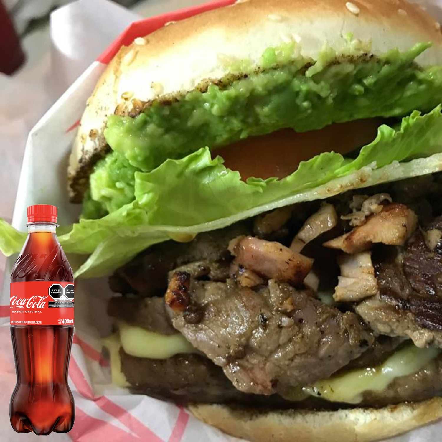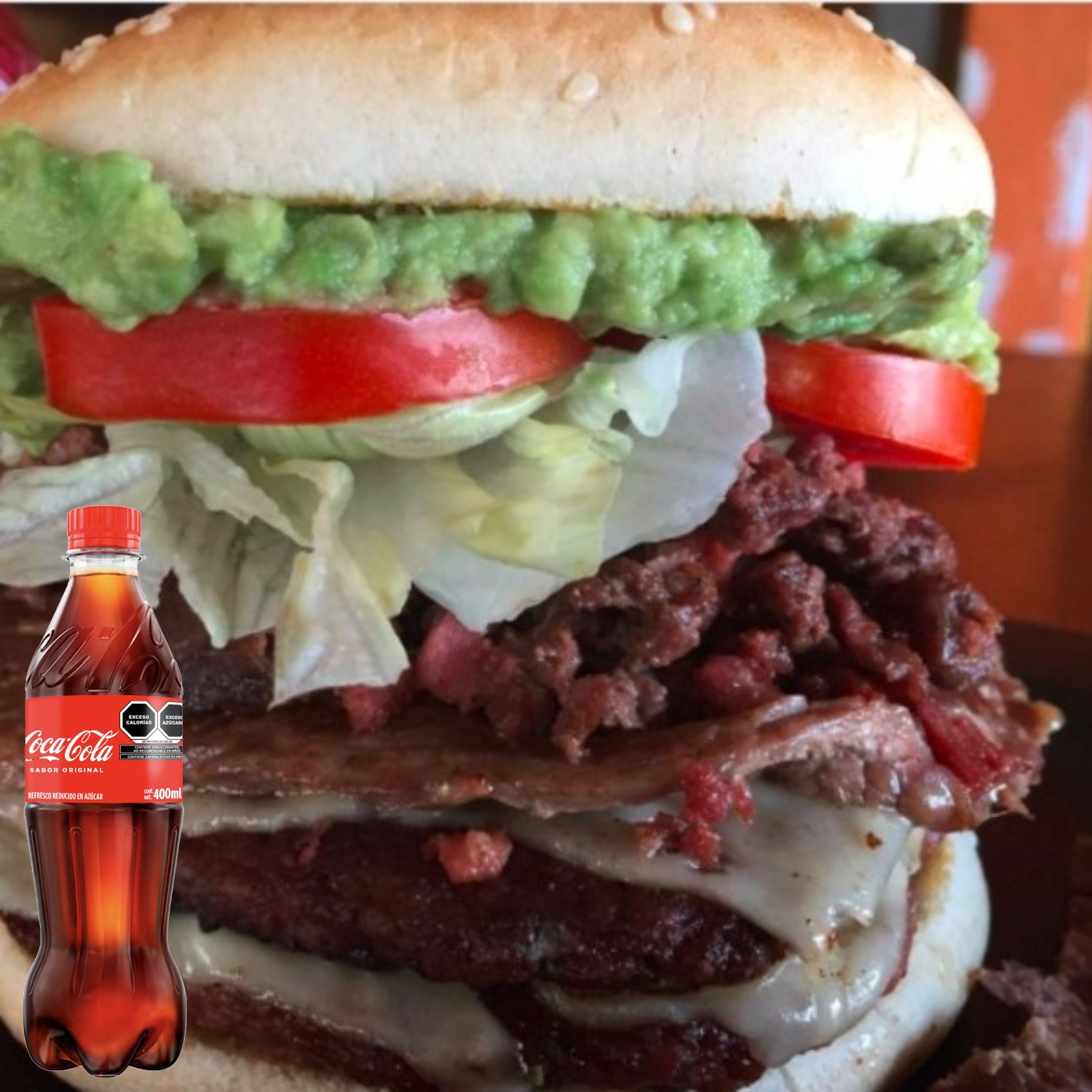 1 coca cola 355 + papas francesas+ Doble carne, queso, tocino, lechuga, tomate, aguacate, sirloin, picado y arrachera.
